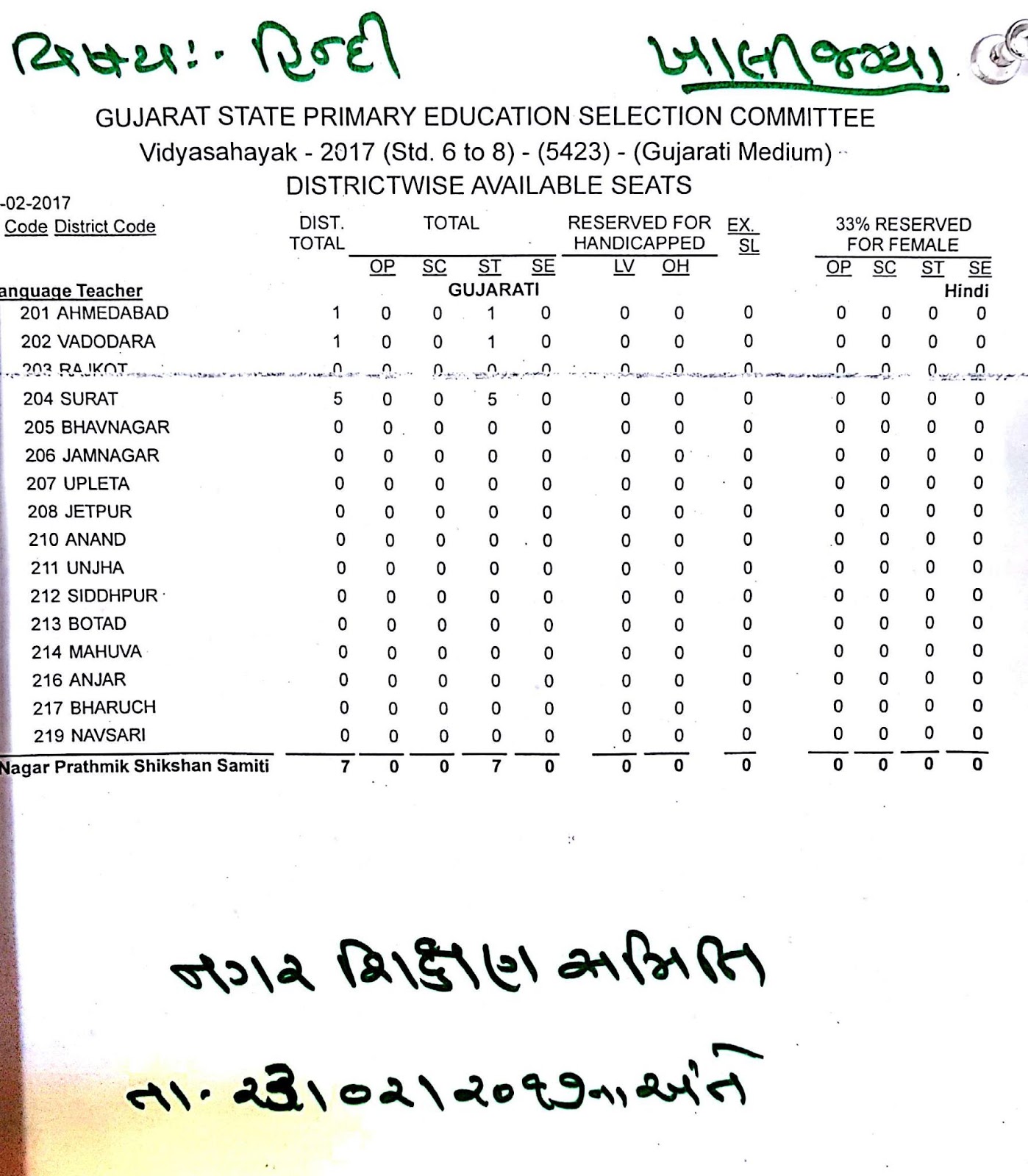 VIDYASAHAYAK BHARTI -2017 FIRST ROUND ANTE KHALI JAGYAO NU OFFICIAL LIST - JILLA SHIXAN SAMITI TATHA NAGAR SHIXAN SAMITI - SUB- HINDI.